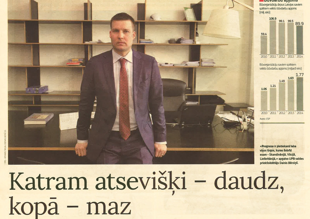 At the same time, the UPB chief does not predict a lot of growth for the local market this year. He points at global events: the military conflict between Ukraine and Russia, which affects the investments coming into Latvia from the East and creates reservations for investors from the West. Furthermore, the local market is affected by breakthroughs in the EU structural fund programmes. Should both these circumstances coincide, growth could begin again in the middle of 2016. This is not good for the industry in general, because such great rises and falls lead to low efficiency throughout it. “This is the same as in any other manufacturing industry: stability enables maximum efficiency,” the company chair explained. He also commented on the number of employees in the industry: according to the latest statistical data, it is very unstable. This means that, during the periods of lower activity, the industry loses its specialists and bringing them back can be complicated. This also leads to higher competition among companies, which, eventually, affects the quality of construction. “If, in a stable market, the client is the winner, then, in the current market conditions, the client only loses,” D. Berzins pointed out.